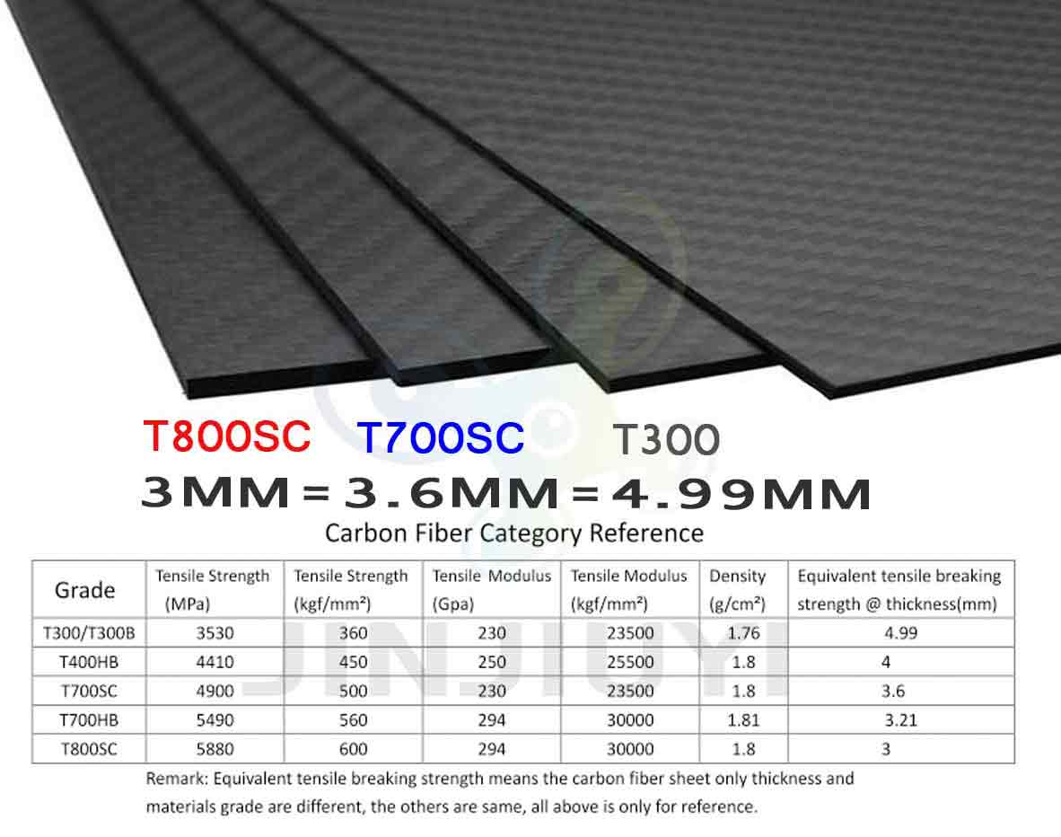 Remark: Equivalent tensile breaking strength means the carbon fiber sheet only thickness and materials grade is different, the others are same, all above is only for reference.