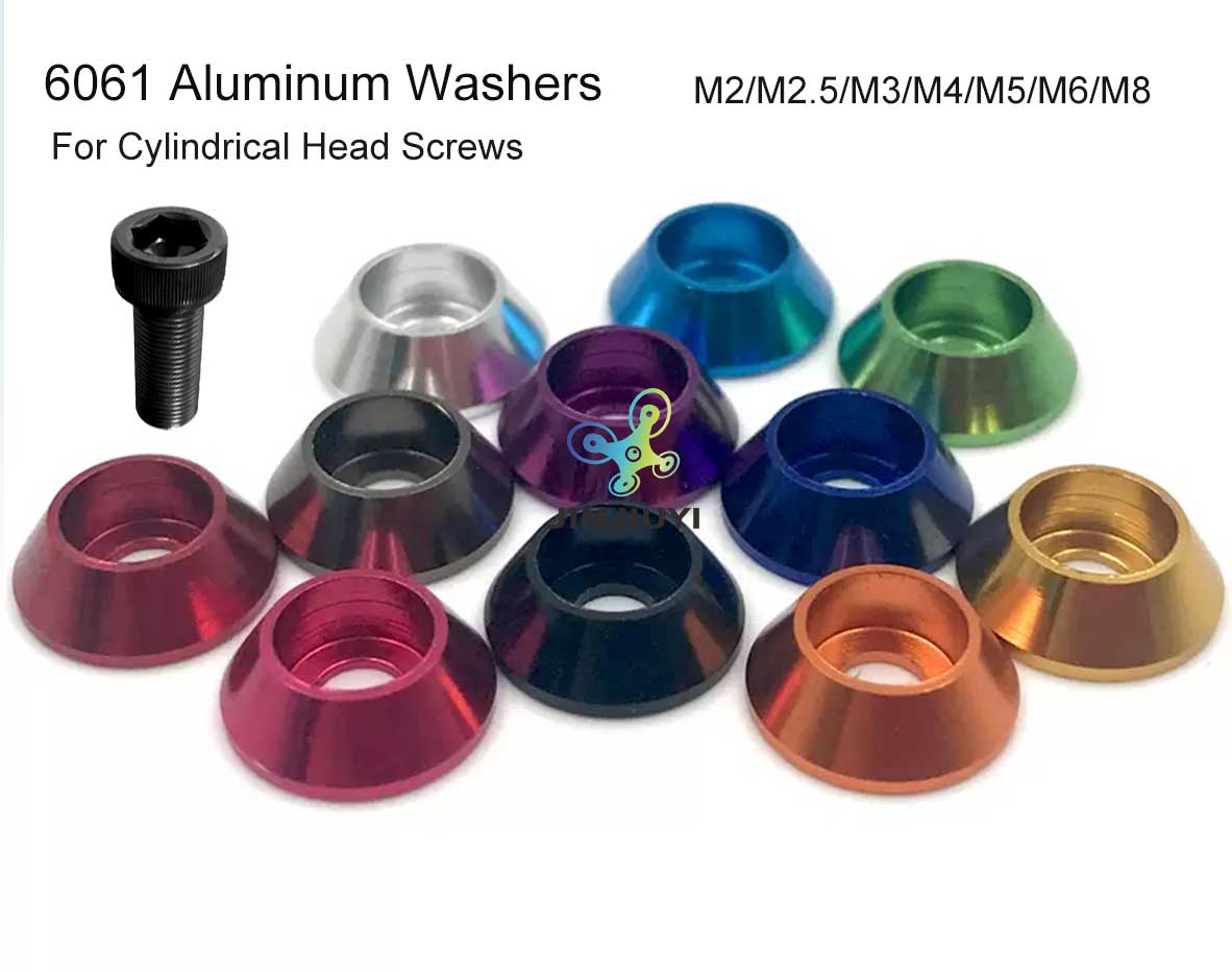 We produce and sell cap head washers for M2/M2.5/M3/M4/M5/M6/M8 socket head screws for RC parts and FPV frames. These washers provide additional support and protection, ensuring a tight connection between the screw and related components. Our aluminum washers are designed to withstand high pressure and high temperatures, while also offering excellent corrosion resistance. If you need more information or have any questions, please feel free to contact us.